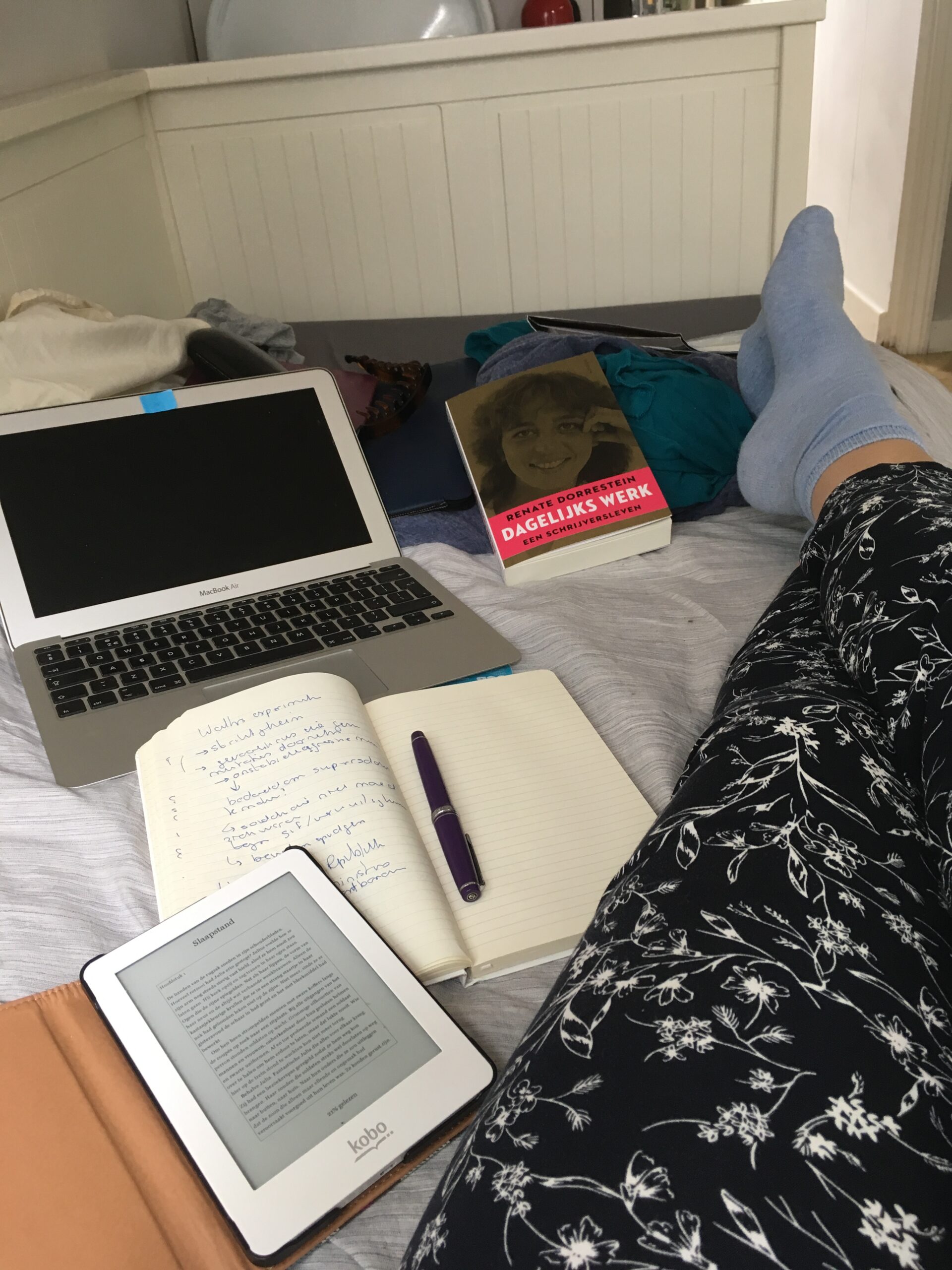 Ik kwam aan in Cambridge, waar het tropisch warm was en de gazons geel kleurden door de droogte dat jaar, en nam mijn intrek in een minihuisje in de tuin van een Ierse vrouw en haar dochter. Elke ochtend liep ik met mijn MacBook, notitieblokken, pennen, telefoon en flesje water onder de arm langs de rivier, door het park naar de binnenstad, waar ik een fijne plek zocht om te schrijven. Mijn favoriete plek was het terras van een pub aan het water, waar ik genoot van echte Engelse koffie (enorme slappe bakken, lekkere taart erbij), grote glazen cider en ‘pub grub’ tussen de middag, terwijl ik mezelf met hart en ziel op de wereld van Leegland stortte.
