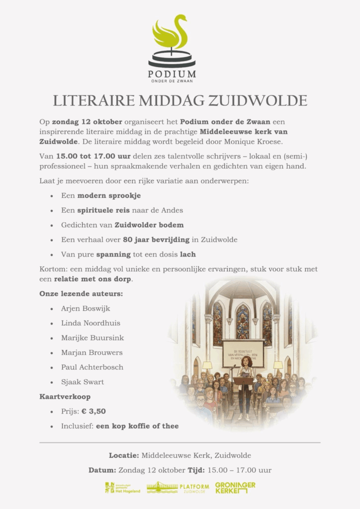 Natuurlijk zit ik het liefst braaf te schrijven, maar mijn boeken moeten natuurlijk ook onder de aandacht worden gebracht. Dus zeg ik graag ja als organisaties mij vragen om te komen vertellen over Anderland, Zonderland, Leegland of Tussen de Dijken. Hier kun je lezen waar en wanneer ik te horen of te zien ben.